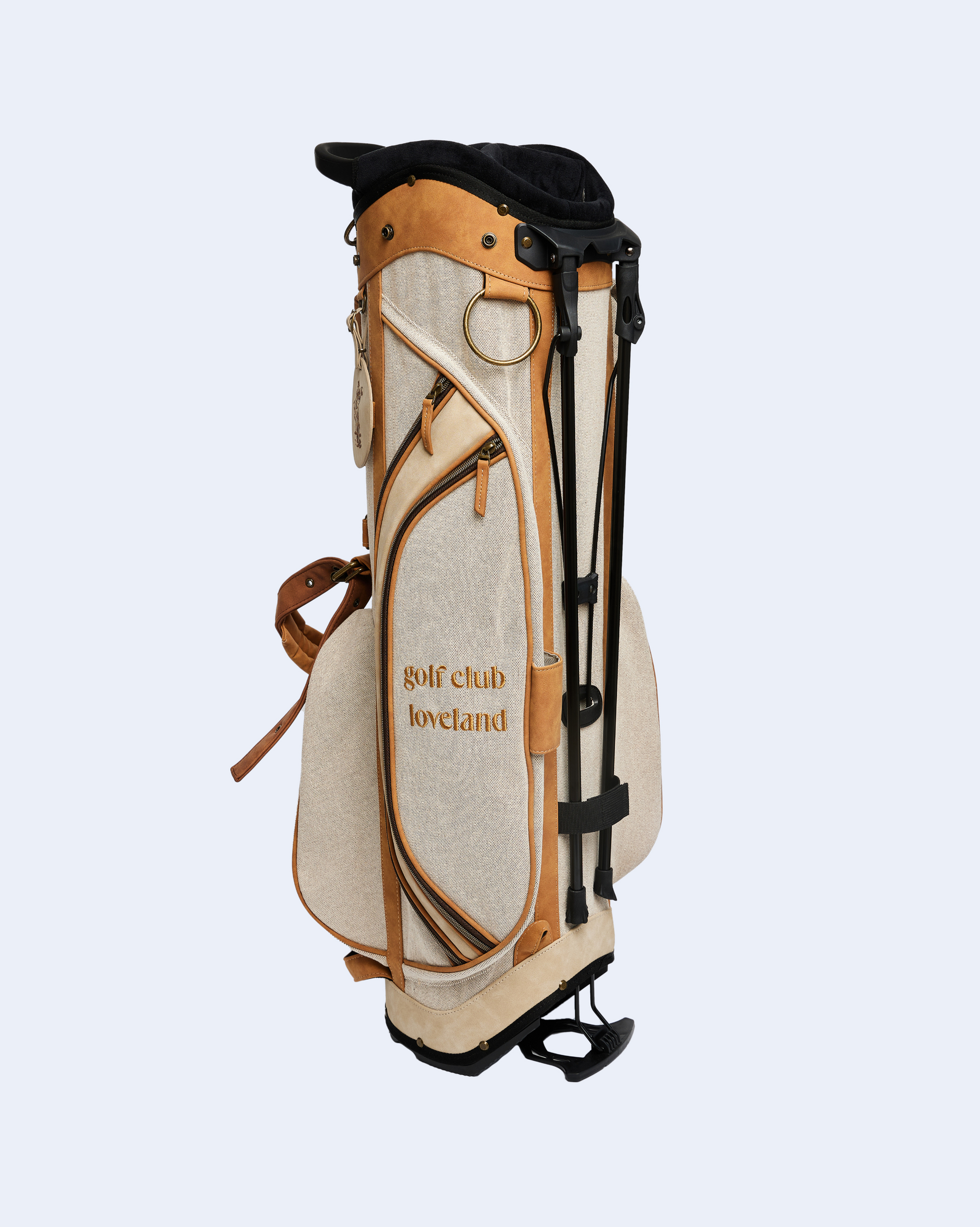 Inspired by 1970s-80s American retro golf bags, this stand bag combines vintage aesthetics with modern functionality. The exterior features PU leather with a distressed finish, complemented by canvas panels and intricate embroidered details. Branded antique-style metal hardware and multiple storage pockets add both authenticity and convenience. The integrated stand system ensures stable placement on any terrain, blending classic design with contemporary reliability.
