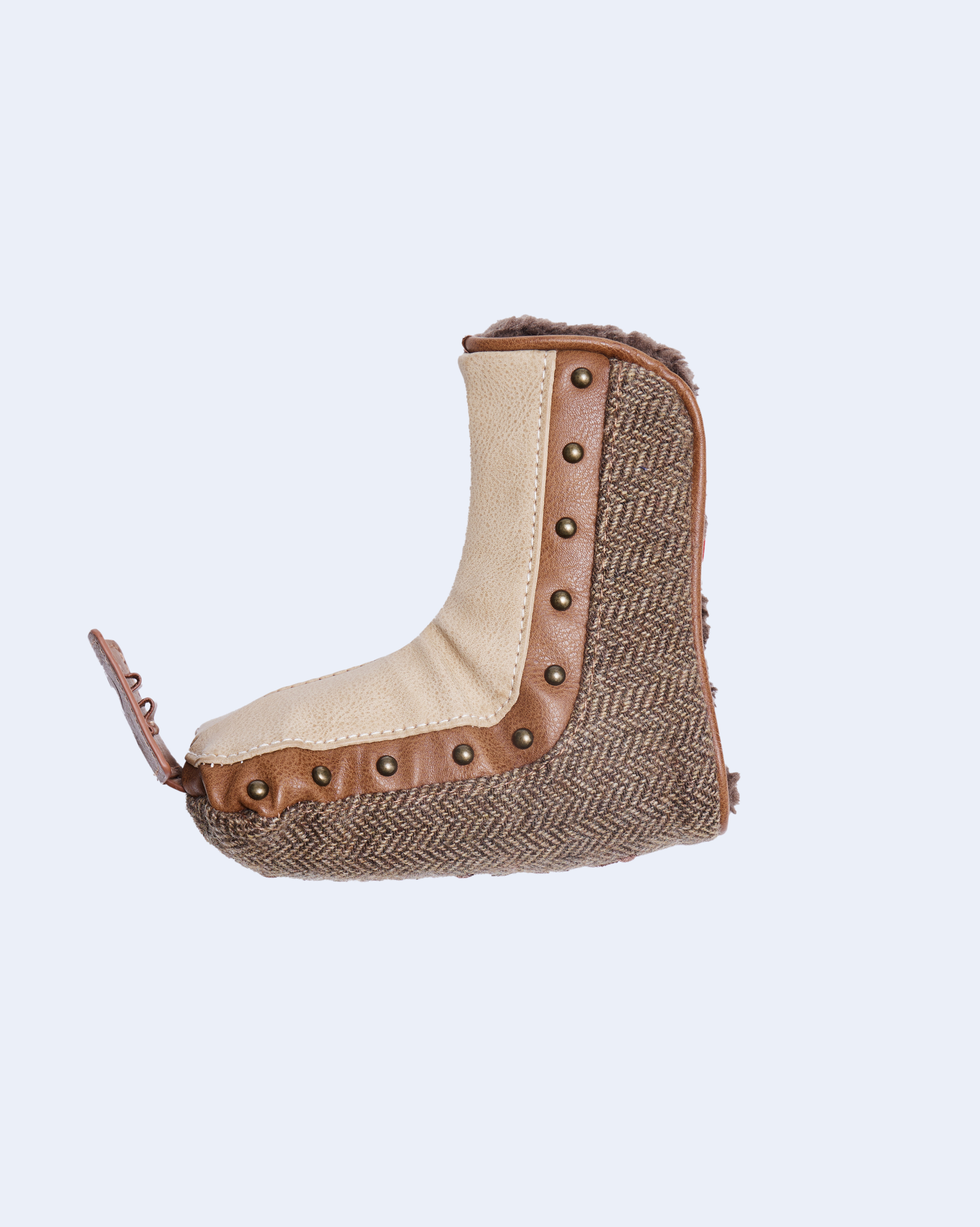The Indispensable Piece: This putter headcover elevates the signature patchwork design with refined details—antique rivets, emblems, and contrast stitching. A soft fleece interior and a rich tweed-and-leather shell create a distinctly warm, seasonal aesthetic.